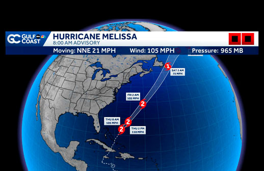 Según el National Hurricane Center (NHC) de los Estados Unidos, Melissa era alimentada por vientos de cerca de 170 km/h al momento de su paso por el extremo sureste de las Bahamas y por las islas Turks & Caicos, ayer. La tormenta avanzó durante la noche hacia las Bermudas, por el noroeste del archipiélago, pero ya con menos violencia y una categorización de nivel 2. Melissa seguirá durante el día de hoy su avance hacia el norte y alcanzará las costas de Terranova en Canadá durante las primeras horas del sábado.