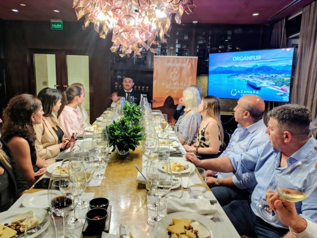 El encuentro buscó detallar a los agentes presentes el estilo distintivo de Azamara. Se recreó parte de la experiencia a bordo mediante una degustación de vinos y quesos en el salón La Vinoteca del hotel.